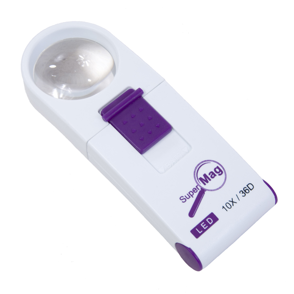 The SuperMag 10X/36D power LED handheld magnifier is the finest in the industry and is a must have for anyone with reduced vision. Use the magnifier on newsprint, books, magazines or photos for crystal clear viewing. The LED bulb provides extra light when necessary and never needs replacement. The magnifier measures less than 6 inches in length and can be comfortably used at home or tucked into purse or briefcase for on – the – go magnification. It really comes in handy for those long trips! The magnifier comes in its own soft vinyl drawstring carry case and storage/gift box.