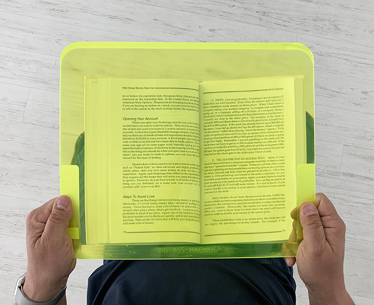 The Sheet Magnifier provides 3.5X by changing the distance between the Fresnel lens and your document. The magnifier allows you to find the best, most comfortable magnification level. It is large enough to magnify a full page of hard to read small print. There are Grasp-bars on the side of the Fresnel Lens for easy handling to prevent no scratch while using.