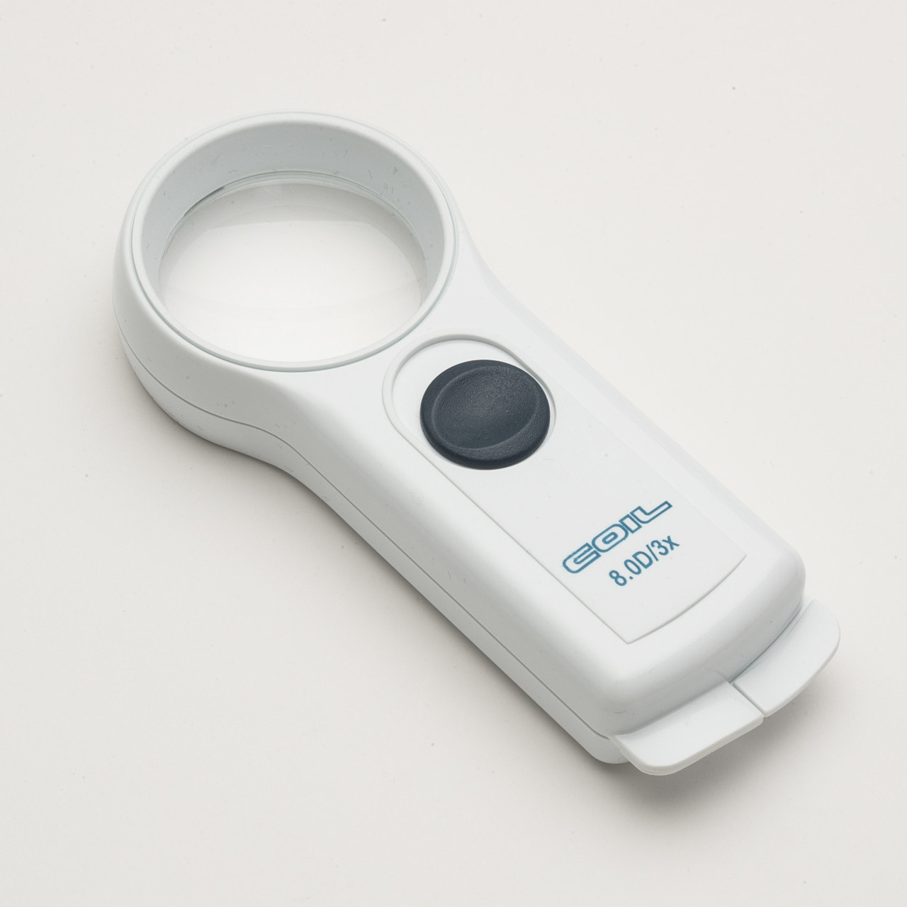 Coil 3X / 8D is compact, lightweight and small enough to fit in a pocket or handbag. Lenses measure 1.88 inches and handles measure 3 inches. Bi – aspheric lenses are optimized for minimum distortion and maximum clarity. The LED version offers extended battery life and substantially longer bulb life. Comes with a protective pouch.