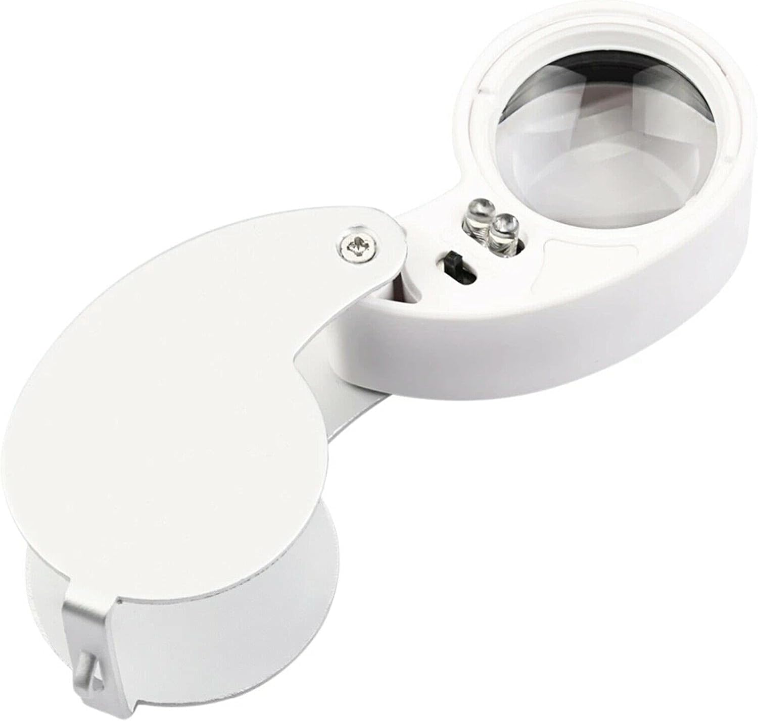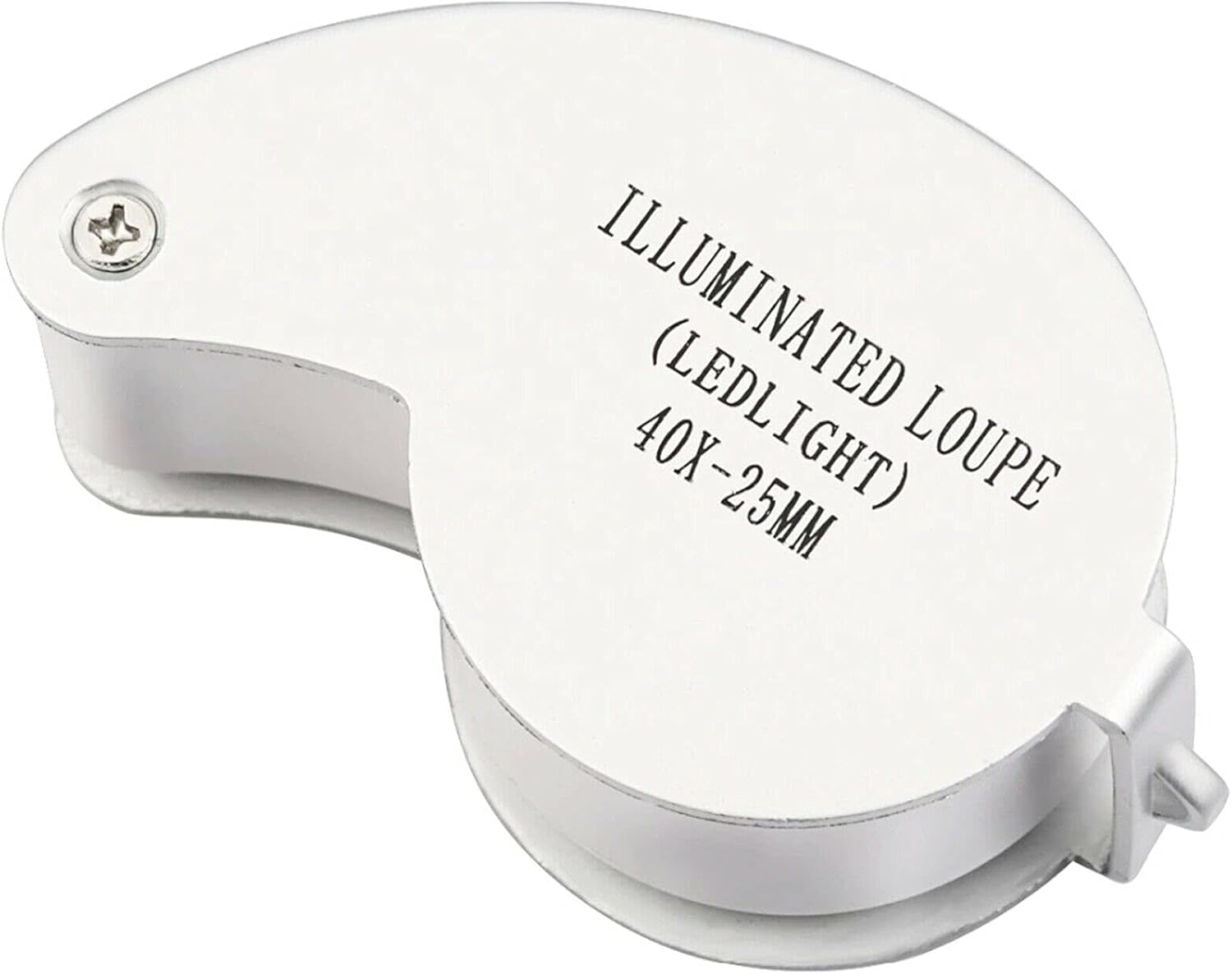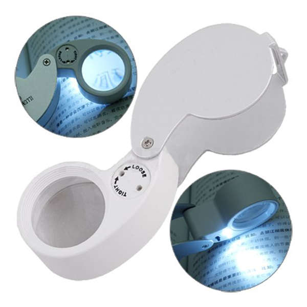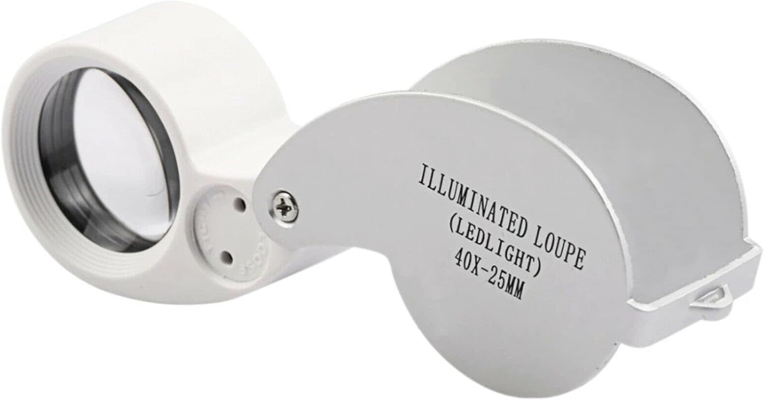 40X Jewelers Loupe Folding Magnifier Tool 25mm Lens has a crystal clear viewing lens, compact folding capability with screw pin holds, On-Off LED slide light switch, battery compartment lock key, slotted end for key chain or chain attachment, silver metal construction, and case included. Magnifier Eye Piece is a nice size hand held pocket Loupe.