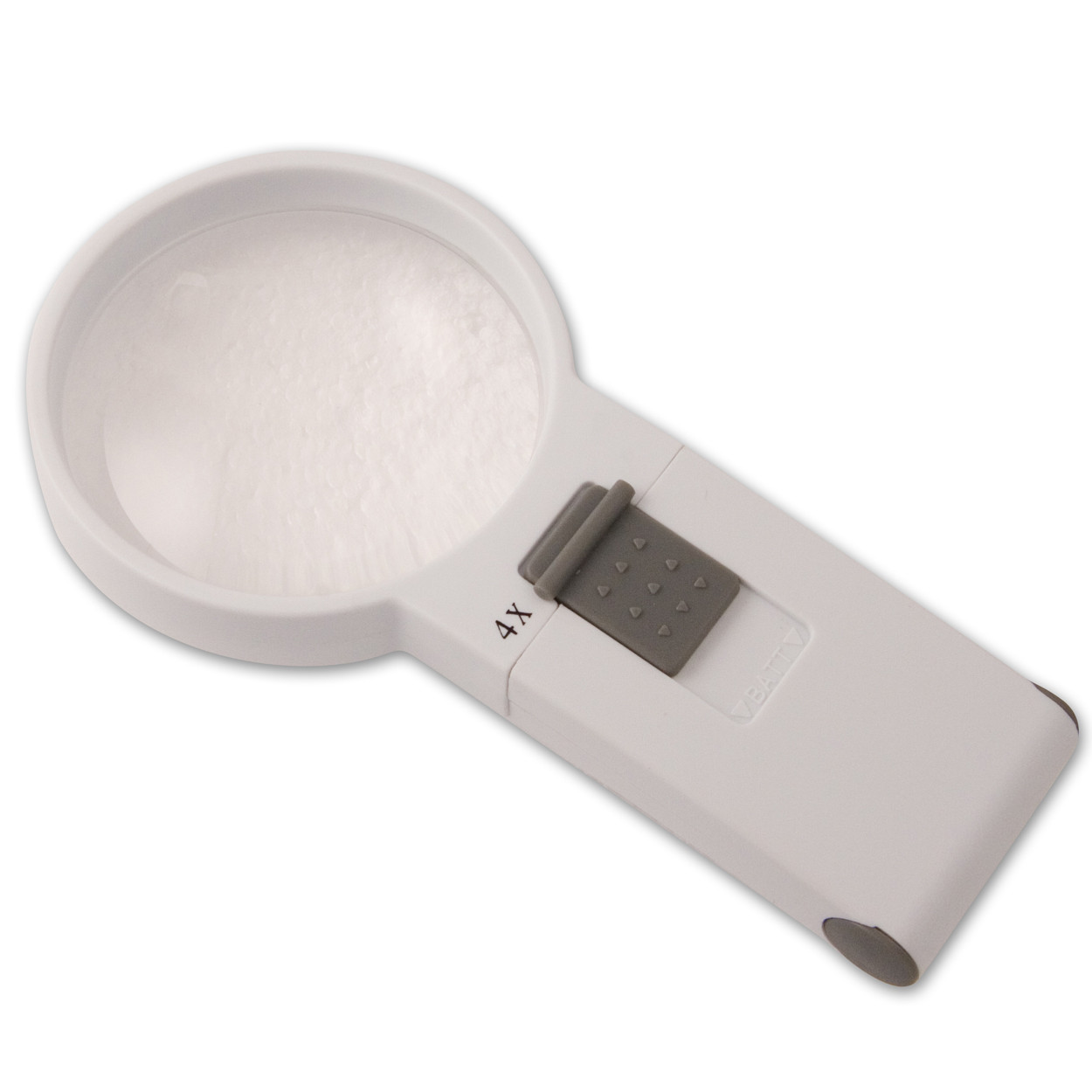 The SuperMag 4X/12D power LED handheld magnifier is the finest in the industry and is a must have for anyone with reduced vision. Use the magnifier on newsprint, books, magazines or photos for crystal clear viewing. The LED bulb provides extra light when necessary and never needs replacement. The magnifier measures less than 6 inches in length and can be comfortably used at home or tucked into purse or briefcase for on – the – go magnification. It really comes in handy for those long trips! The magnifier comes in its own soft vinyl drawstring carry case and storage/gift box.