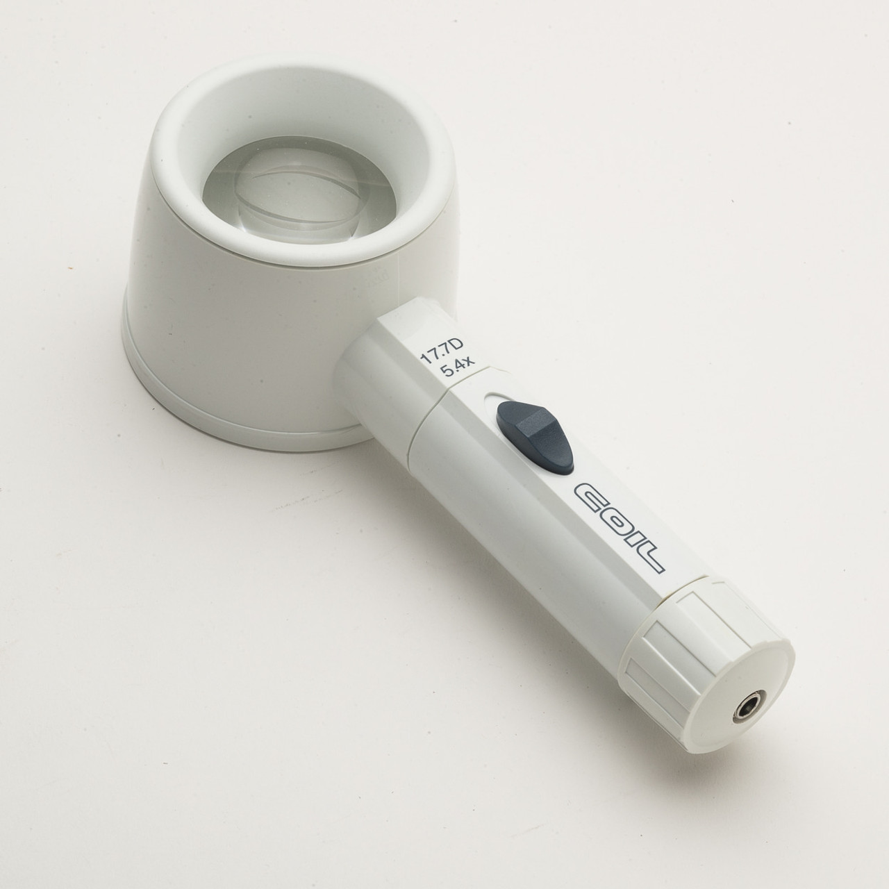 5.4X/17.7D. Hand-held magnifier (lens size: 44mm or 1 3/4 inches in diameter) with built-in light provides shadow-free and reduced-glare illumination. It has a fixed focus so it lays directly on the printed material.