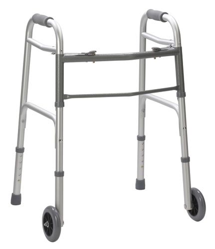 Adult Extra-Wide Two-Button Folding Walker with 5″ Wheels – Lightweight Aluminum Mobility Walker