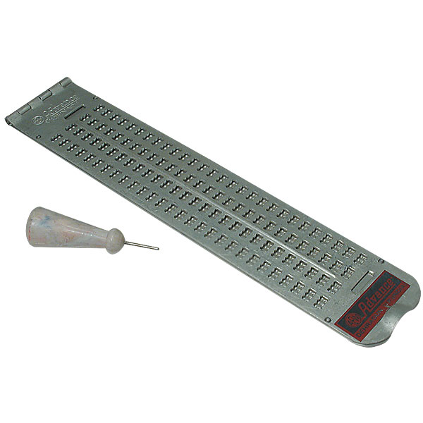 4-line x 28 cell metal Braille slate. 1/2″-wide slots on either end allow vinyl tape to be threaded through and held in place, allowing the user to make their own Braille labels. It’s crafted from heavy-duty Aluminum. Stylus included.