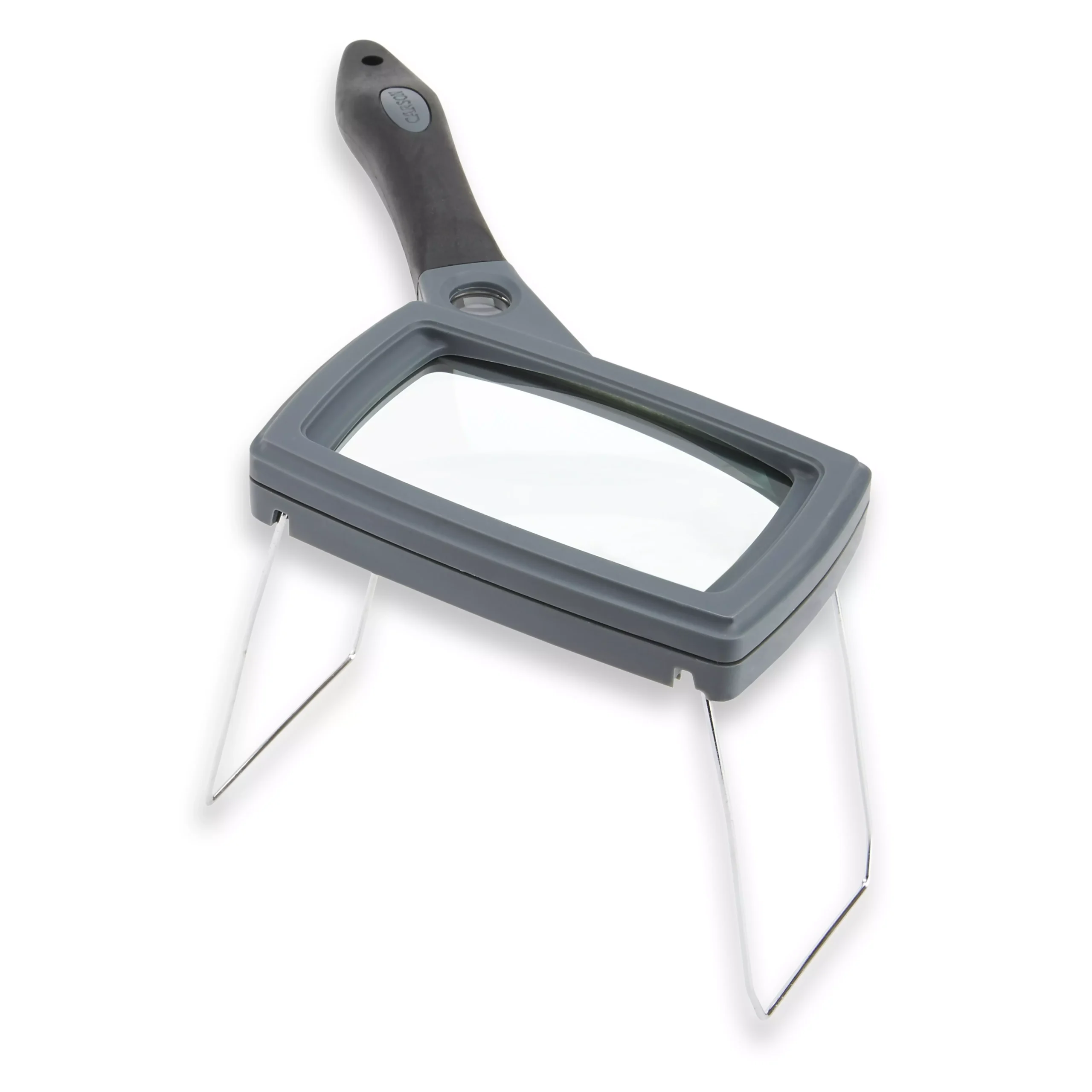 Our hand and stand magnifier offers the versatility of handheld or handsfree use. The 2x glass lens with built-in 11.5x spot magnifier increases the SG-16’s range of use while providing maximum durability. The ergonomic SureGrip™ handle adds comfort while in handheld use or easily transition to hands free use by extending the metal drop-down legs (stows easily in handle during handheld use). The rectangular shape of this magnifier is designed specifically with reading in mind. The SureGrip™ rubberized handle is mounted at an angle for additional comfort while providing a more natural viewing position. The variable range of use of the SG-16 while in the stand position is great for threading needles, removing splinters or any time when two hands are needed. This magnifier is perfect for those with limited hand strength who also want the durability of a glass lens. Includes a soft zippered case for protection between uses.