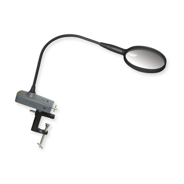 A lighted, fully-adjustable, flexible arm Hands Free Magnifier that attaches to your table-top for convenient Hands Free use. Its large 2x power lens gives you a sharp, distortion-free view, and 3.5x power spot lens allows you to see even the finest details with ease. Three super bright LED lights allow for use in low-light conditions. This Magnifier operates on 3 AAA batteries (not included) or supplied 4.5v DC adapter.
