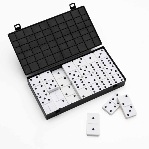 Double Six domino set has plastic 1″ x 2″ pieces with raised dots. Double Six set has 28 pieces.