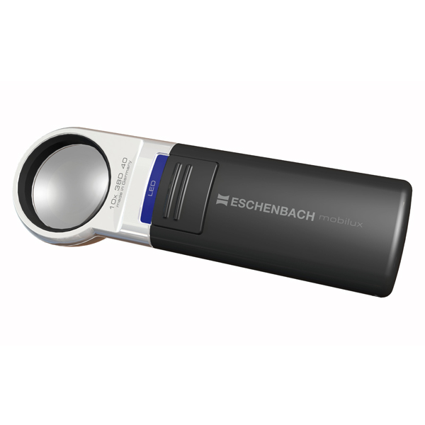 The high magnification 10X Mobilux LED Illuminated Pocket Magnifier is designed to be a portable Magnifying Glass. The Battery Operated Illuminated Magnifier is powered by 2 standard AA size batteries and its LED light bulb used has an unlimited life so no bulb changes are required. This range of Illuminated Hand Magnifiers has been updated and improved. This item code of 151110 replaces the previous item code 1510104. The Hand held Lighted Magnifier has an easy-to-use switch and the removable dust case provides optimum protection for the lens with a strap to attach onto a belt.
