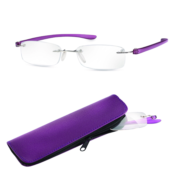 These new ready-made readers are available in 2 colors – anthracite and purple, and in two frame sizes (large and small). An attractive, color coordinated zipper case is included to protect the glasses when not in use.