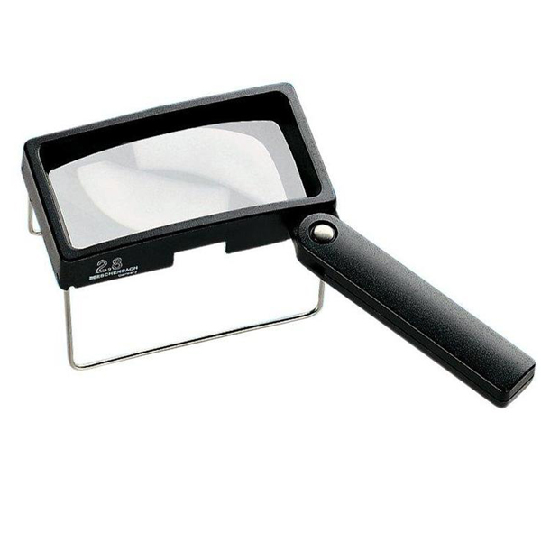 The Eschenbach 2.8x rectangular magnifier is designed to offer two magnifiers in one! First, the magnifier can be used as a standard hand-held magnifier. Second unfold the metal legs and use it either as a fixed stand magnifier or tilt it down and use it as an inclined stand magnifier. For portability, simply fold in the metal legs, fold in the handle and slide it into its leather case!