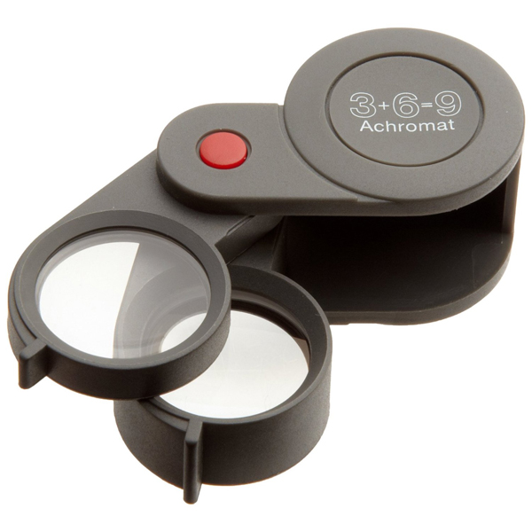 Two achromatic, coated, glass lenses, provide a color-aberration free image. A total of 9x magnification with one 3x lens and one 6x lens. The body is made of reinforced glass-fiber durable polyamide. The air tight body prevents dust, which produces scratches, from entering.