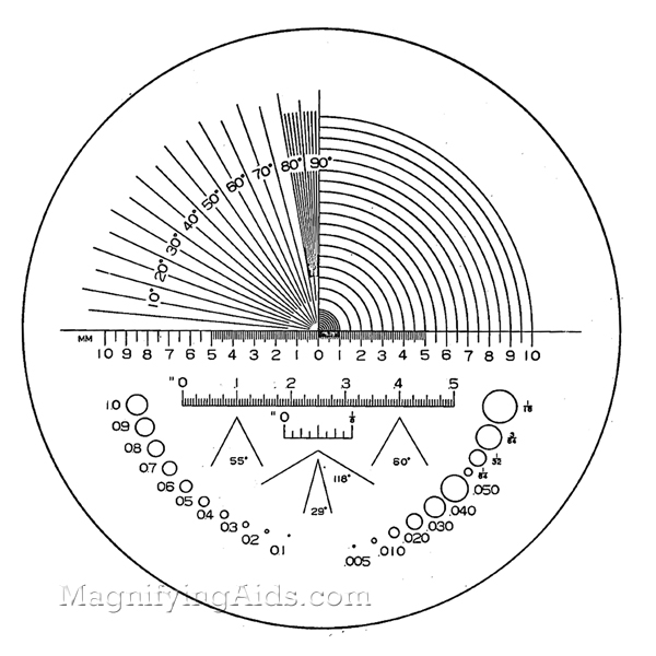 * Ten circles with diameters – 0.1 to 1.0 mm –10° with 0.005″ to 1/16 diameter. * Angle scales –29°, –55°, –60°, –188°.