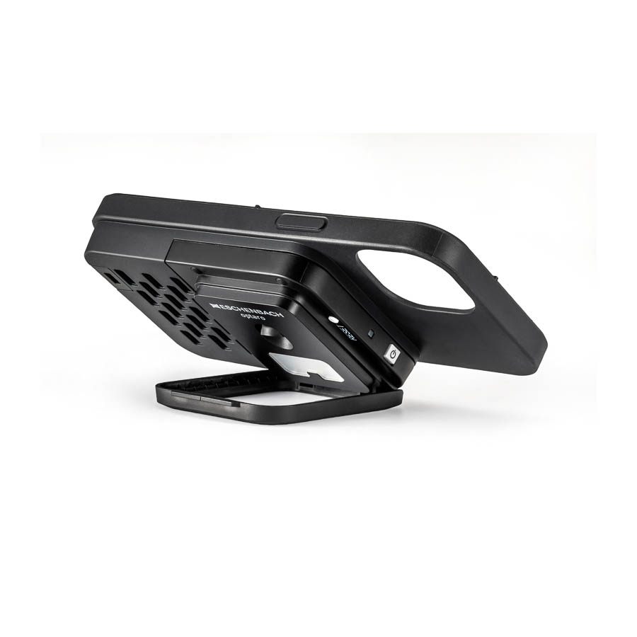 The fold-out stand on the Optaro® holds the iPhone at an ergonomic angle and the camera, located under the center of the phone, automatically swivels into the reading position when folded out to ensure there is no on-screen distortion or orientation issues.