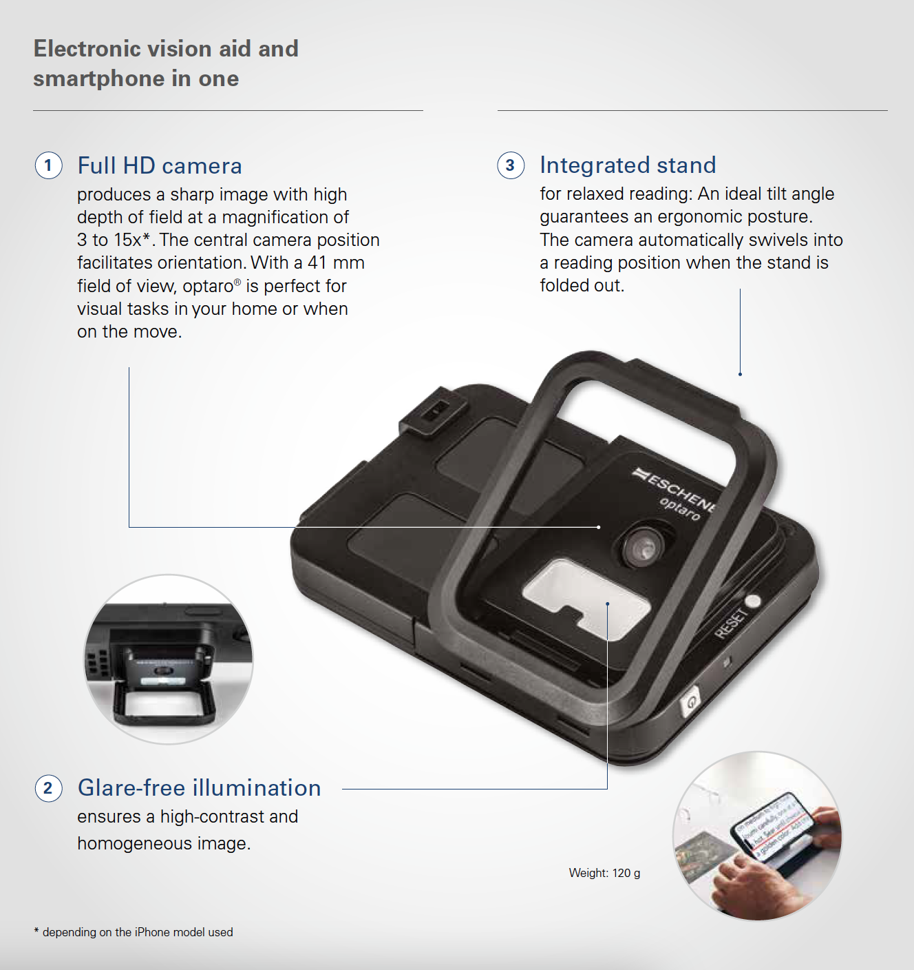 Once connected, the Optaro® camera module provides a Full HD image, 3.3x – 15x magnification and a large field of view through the iPhone screen. The LED illumination can be adjusted, or turned off, ensuring a glare-free image, and there are 14 color mode options to select from. With adjustable reading lines and blinds, a read aloud function, and customizable menu, the Optaro® is designed to provide a more comfortable viewing experience for those with vision loss.