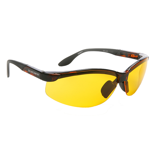 All SolarComfort® filters block 100% of UVA/UVB rays and are made with bend-to-fit temples for a custom fit. Frames are made of lightweight nylon 66. The tinted lenses block visible light in the following wavelengths: gray and plum lenses (400nm); yellow (450nm); amber (511nm); orange (521nm).