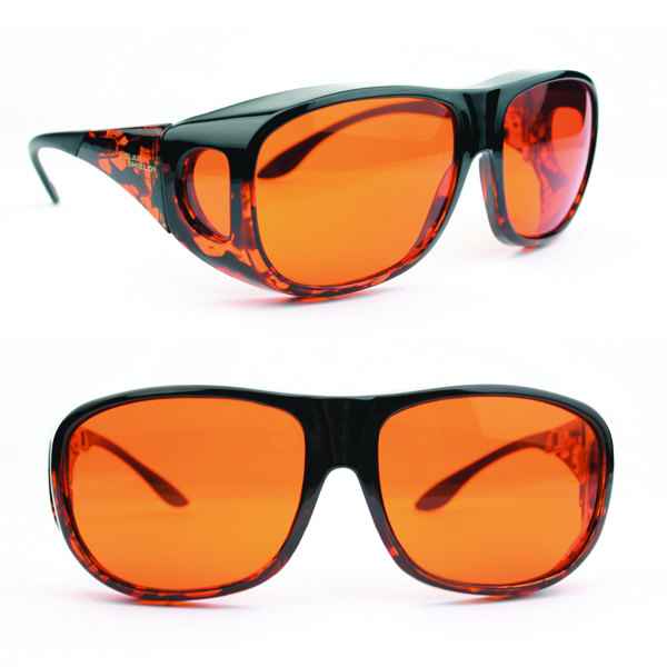 Large frames [replacing Aviator] fit over Rx frames not exceeding: 6″w x 2″h – 153mm x 49mm. The orange poly-carbonate lens provides medium range blue light filtering, which is ideal for contrast enhancement and improves visual acuity. It blocks 100% UVA/UVB light and 100% visible light up to 521nm.