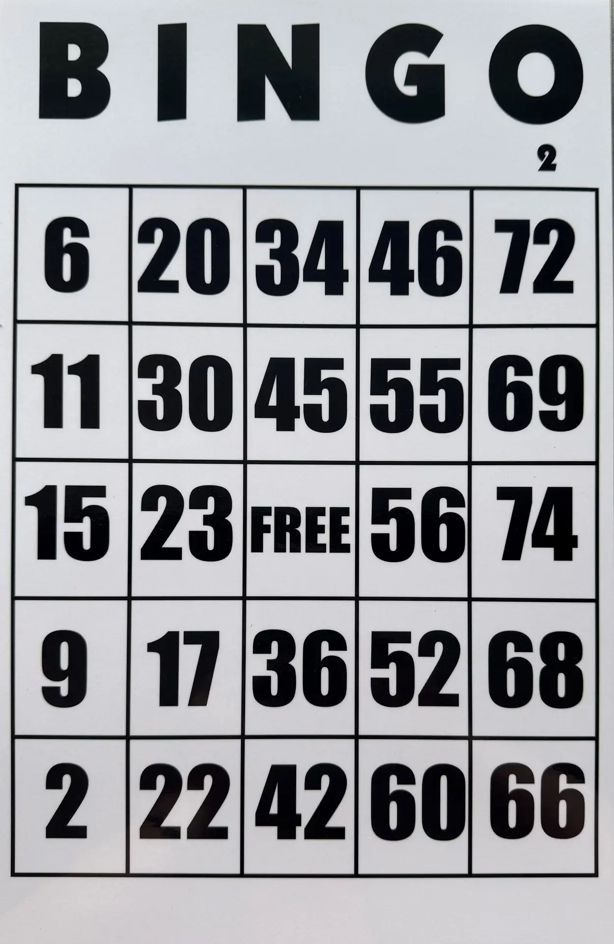 This card is a wonderful product that was developed for the visually impaired. Large, sharp, bold black numbers on a white background are easier to see and read than standard bingo cards. Now all you bingo players can play this game without stress, in a relaxing and enjoyable fashion. The card is laminated for durability and longevity, and will stay in like-new condition regardless of spills and messes. Just wipe clean. This giant bingo card measures 11″ x 17″. The numbers are 2″ in size and are presented in numerical sequence and random order. 1 card to a pack.