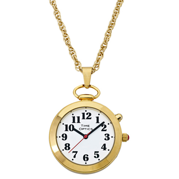 Time Optics is proud to be the first to combine technology and fashion, to create our Amazing Fashionable Talking Gold tone Pendant Watch. (Special IPG Plating that keeps your watch looking new!). Using our own UNIQUE Talking DUAL VOICE (switches voices to either male or female with the push of a button), Chip, our talking pendant not only tells you the time, month, day, date and year, but it has an added Alarm Feature. Our Talking Pendant watch features a beautiful shiny gold tone case, with both a bale (so the pendant lays flat) and 30 inch chain, which fits over most heads for easy on and off. It is also long enough to lift up and see the time with the bold numbers on a clean white dial. Our watch also features a Fashionable Pumpkin Crown with a beautiful cabochon accessory. It also aids those with Macular Degeneration and other eye issues. This is just the perfect size pendant and chain to make a beautiful fashion statement.