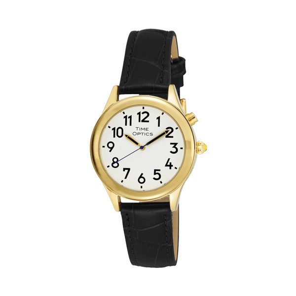 Our Ladies Talking Watch, gold tone, with Genuine Leather Black Croco grain Strap, is a timeless piece that is classic and stylish. Our Unique Dual Voice (male or female) Talking Chip with Alarm Feature is unique to our Time Optics Brand. The Black textured Croco Grain Genuine Leather Strap only adds to the beauty of the watch. The clean white dial with the black bold numbers and sapphire blue second hand make it easy to read, and our over-sized Pumpkin Crown adorned with a Cabochon completes the look of this watch. With a push of a button you can hear the clear voice which makes this watch ideal for people with low vision or just want a stylish watch.