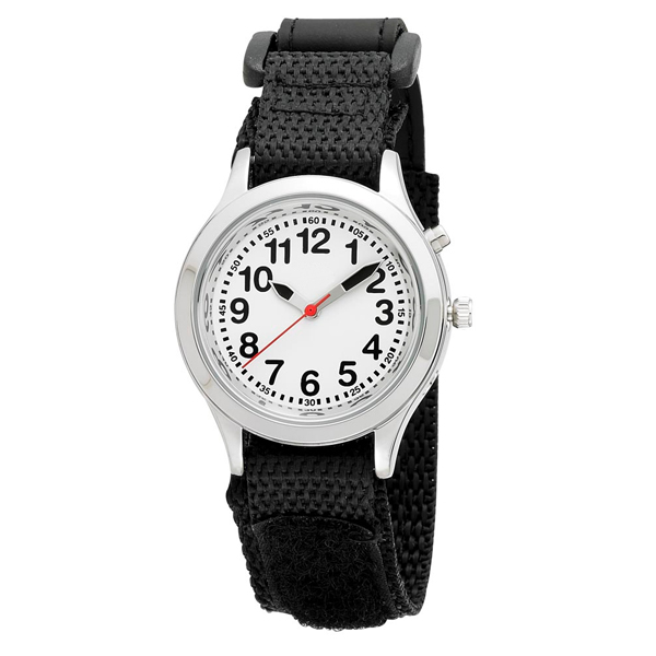 Just the right size for the young. Bright easy to read numbers with a red second hand. Great for learning time! Features both Male and Female voices that announce the Time by pressing the button once. Pressing the button twice announces the Day, Date, and Year. The watch also has an alarm which can be easily set On or Off. The strap is a fashionable gender appropriate colors and fits any size. Packed in a bright, fun yellow pouch.