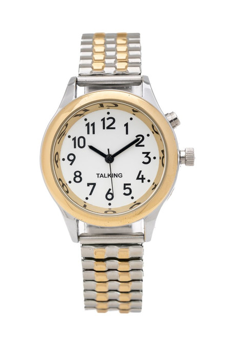 This is a true quality and elegant looking Ladies two tone talking watch. While it has only one button, this watch announces the Time, Day and Date, Year, and has an Alarm. Very simple to set and even easier to use.