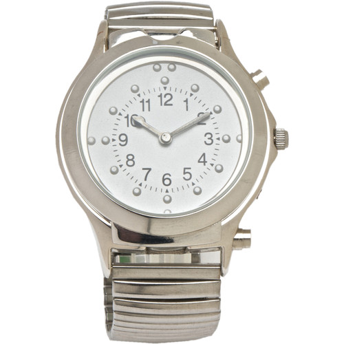 This talking watch also has tactile features for when you don’t want sound. Cover for Braille face opens with easy push button action and face has three marks at 12, two dots at 3,6, and 9, and single marks in between.