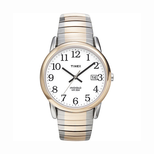 This large black number men’s watch has a 1.50 inch diameter face with crisp, black numbers. It features a gold tone case with two tone metal expansion band. Water resistant to 30 meters.