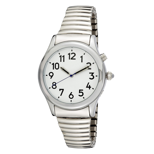 This is a true quality and elegant looking man’s silver tone talking watch. While it has only one button, this watch announces the Time, Day and Date, Year, and has an Alarm. Very simple to set and even easier to use.