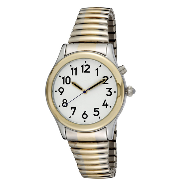 This is a true quality and elegant looking man’s two tone talking watch. While it has only one button, this watch announces the Time, Day and Date, Year, and has an Alarm. Very simple to set and even easier to use.