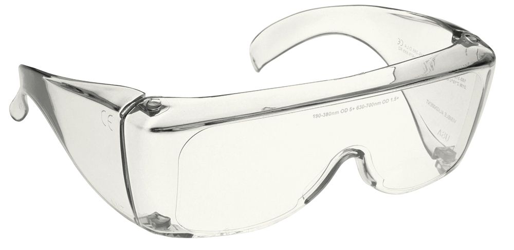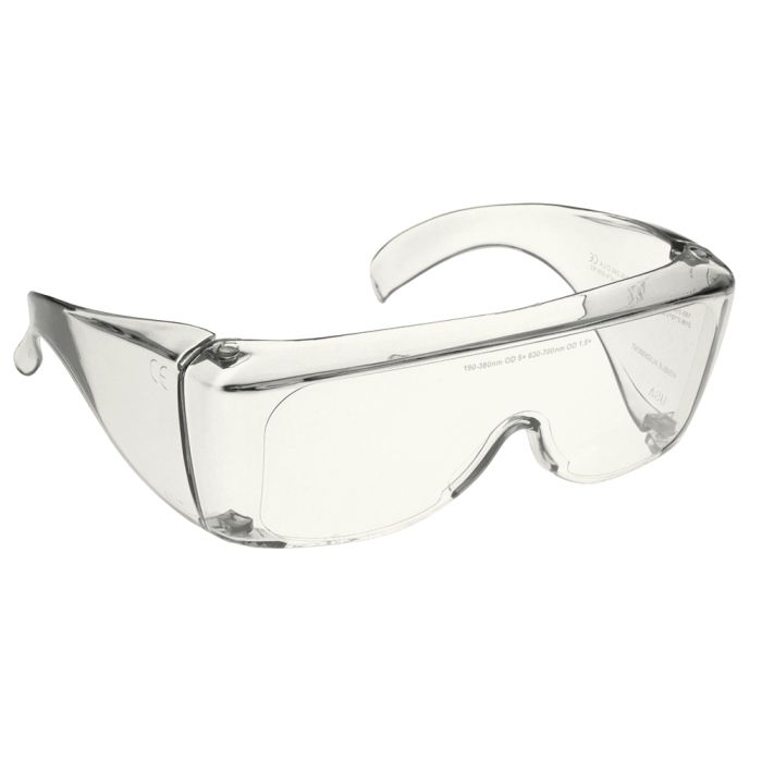 The NoIR U10 Universal Fitover Glasses provide high-transmission eye protection (91% VLT) while shielding against non-coherent ultraviolet wavelengths (190โ400 nm, OD 5+). Engineered for use in medical, dental, forensic, veterinary, and fluorescence lab environments, these CE-certified safety glasses offer a comfortable, full-coverage fit.Featuring a clear polymer filter lens, this model is designed for those needing visual clarity with maximum UV shielding. The wraparound Fitover-Large Frame #700 offers excellent side protection and is suitable for wear over prescription glasses.