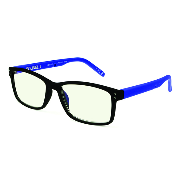 The plano black/blue Polinelli® premium readers include a classic square shape with a pop of color on the temples.