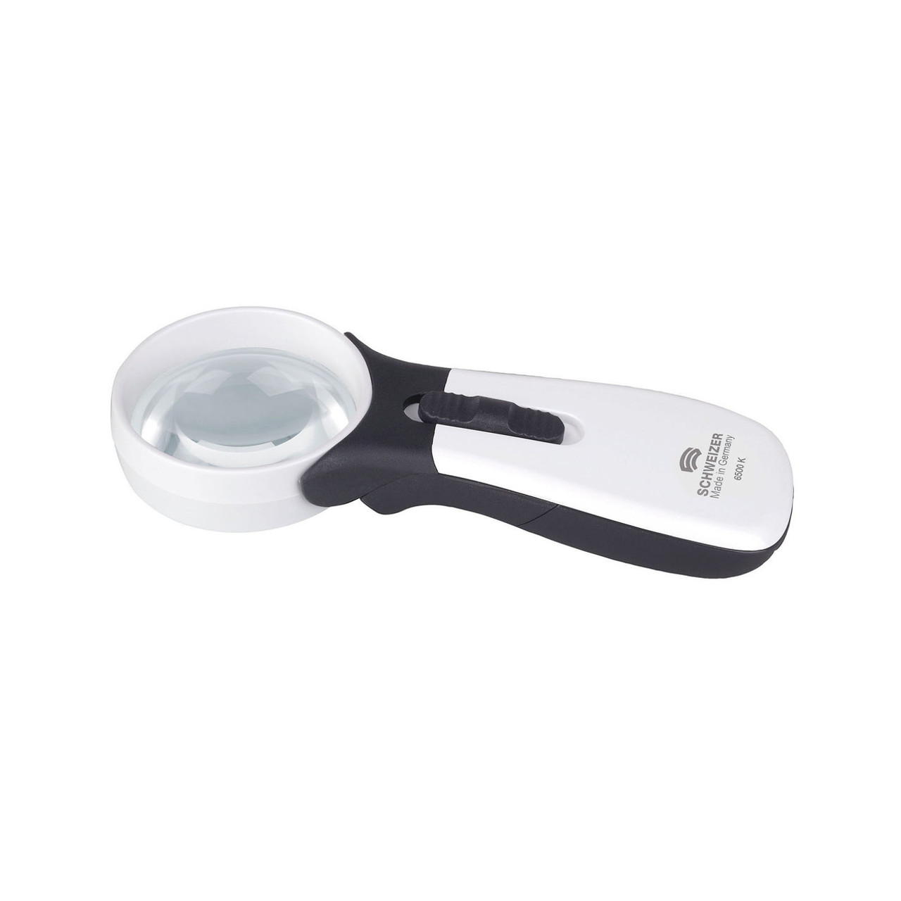 Schweizer’s innovative new hand held magnifiers bring quality, technology and design to the world of optical magnification. Several new features help them provide a great option for the low vision user. The ERGO-Lux MP (Multi Power) mobile series comes in a choice of 11 different powers, ranging from 6D (2.5X) to 56D (15X). In the lower powers, rectangular lenses are available in either an angled or a straight head. LED illumination evenly disperses over the entire viewing area, thanks to the multi-chip SMD LED technology which provides an even spread of light and the precise adjustment of light intensity. The brightness level can be controlled with the 2 step Multi-Power boost switch. The smooth gliding button offers 2 levels of illumination, with an audible click to mark the different steps of illumination. This battery operated magnifier works on 3 AAA batteries (included, for greater convenience.) 18 hours of illumination offered at the lower power of illumination, and 10 hours at the higher level.