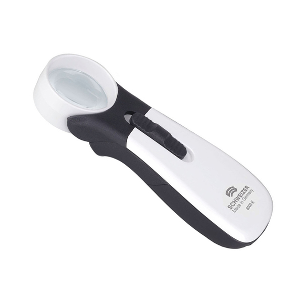 Schweizer’s innovative new hand held magnifiers bring quality, technology and design to the world of optical magnification. Several new features help them provide a great option for the low vision user. The ERGO-Lux MP (Multi Power) mobile series comes in a choice of 11 different powers, ranging from 6D (2.5X) to 56D (15X). In the lower powers, rectangular lenses are available in either an angled or a straight head. LED illumination evenly disperses over the entire viewing area, thanks to the multi-chip SMD LED technology which provides an even spread of light and the precise adjustment of light intensity. The brightness level can be controlled with the 2 step Multi-Power boost switch. The smooth gliding button offers 2 levels of illumination, with an audible click to mark the different steps of illumination. This battery operated magnifier works on 3 AAA batteries (included, for greater convenience.) 18 hours of illumination offered at the lower power of illumination, and 10 hours at the higher level.