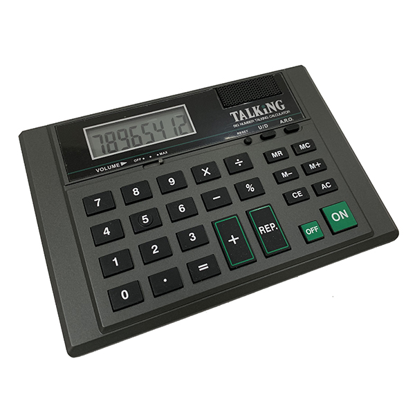 Clear female voice speaks the individual digits or whole integers. Volume control also turns the voice off. It features a large 8 digit LCD readout with numbers that are .62 inches high. The calculator adds, subtracts, divides, multiplies and calculates percentages. Speaks digits and full number.