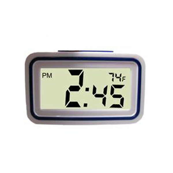 This small, desktop clock shows the time in easy to see digital numbers. The clock displays the talking clock time and temperature. One push button on top of the clock to hear the announcement.