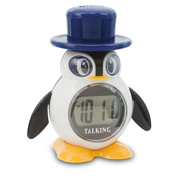 With its adorable penguin design, this talking clock can be used and loved by children and adults alike as a winter holiday design accent, or as a daily alarm clock all year long Features time announcement in a female voice at the simple touch of a button located on top of the clock. You may also choose to have an hourly time announcement. Alarm with choice of cuckoo or 2 musical chimes. Snooze alarm. Large LCD display with 5/8 numbers. Silver with black buttons. Durable plastic.