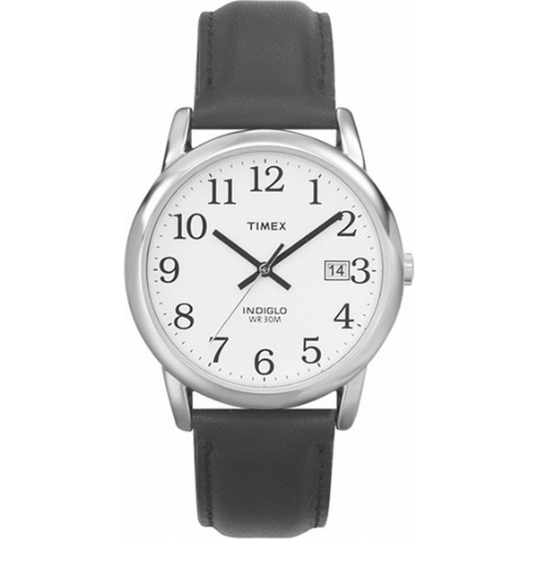 The Man’s Easy Reader Black Leather Strap Chrome-Tone Case Watch by Timex is for the guy whose style sense is understated yet classic. While the watch doesn’t feature all the bells and whistles, don’t underestimate its simplicity for lack of functionality. The metal Chrome-tone case contrasts the rich, durable black leather strap. The pristine white dial has bold, black, easy-to-read numerals and slender black baton-style hands and sweeping seconds hand. There is a calendar at the three o’clock position, and the watch is water resistant to 30 meters.