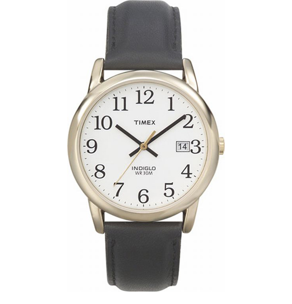 The Men’s Easy Reader Black Leather Strap Gold-Tone Case Watch by Timex is for the guy whose style sense is understated yet classic. While the watch doesn’t feature all the bells and whistles, don’t underestimate its simplicity for lack of functionality. The metal gold-tone case contrasts the rich, durable black leather strap. The pristine white dial has bold, black, easy-to-read numerals and slender black baton-style hands and sweeping seconds hand. There is a calendar at the three o’clock position, and the watch is water resistant to 30 meters.