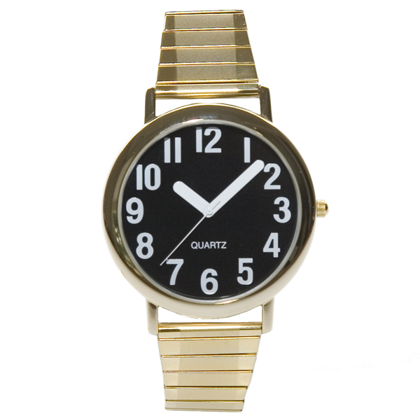 Watches can be worn fashionably and as a conversation piece by both men and women. In addition to the large size (1.5 inch diameter faces), we have designed a watch with extra wide hands for maximum visibility and ease of reading. Even those who cannot see the numbers clearly will be able to tell the time by the position of the hands. A gold colored case accents this black face, white numbered quartz watch, which is offered with a gold colored metal expansion band.